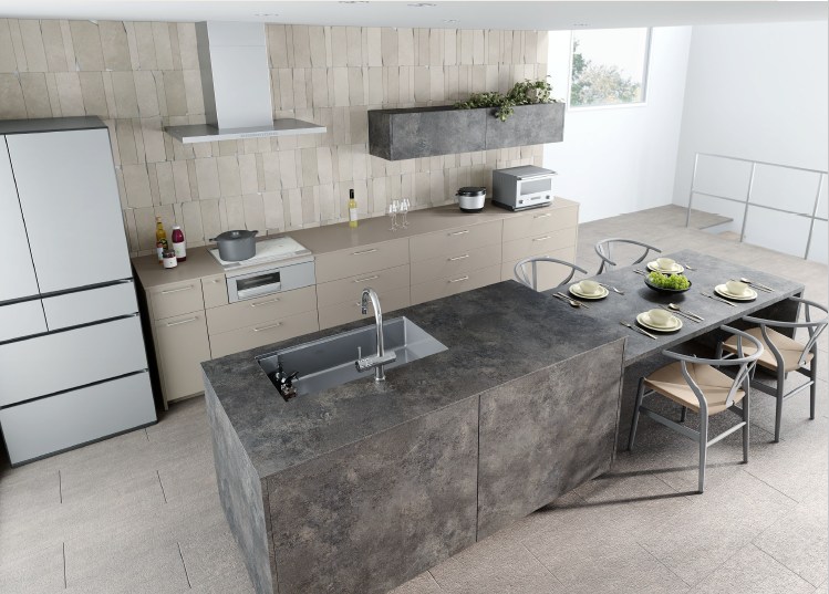 キッチン本体だけでなく、同じ素材・同じ色柄のダイニングテーブル、リビングボード、カップボード(食器棚)までトータルで揃えることができます。これにより、まるで上質な家具で統一されたかのような、洗練されたLDK空間をご自宅で実現可能です。
